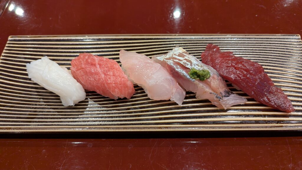 季節の魚を生かした締め方、ネタに合わせたシャリの温度管理、仕込みの丁寧さ――すべてが修行時代に培った教えを礎としている。